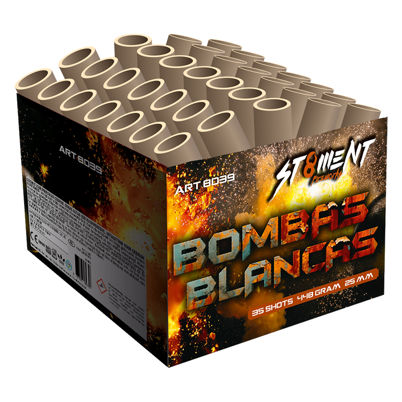 Bombas Blancas is een fanshape cake met 35 schoten uit 25 millimeter tubes. Het effect van deze cake gaat dus breed de lucht in, wat ontpopt in zogenoemde white ghost. Uniek en sierlijk in de breedste zin van het woord. Deze cake gaat mensen gek maken!