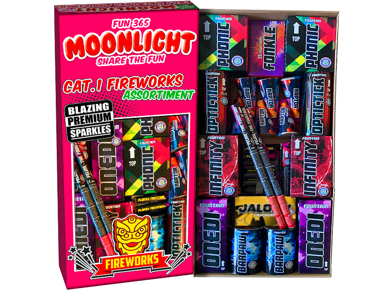 Moonlight nExtra groot pakket vol straatgenot, louter categorie 1 fun voor jong en oud! n nKruitgewicht 223 Gram nTube diameter – nBrandtijd – Seconden nHoogte – Moonlight Goedkoop vuurwerk kopen bij Vuurwerkwinkel Goes