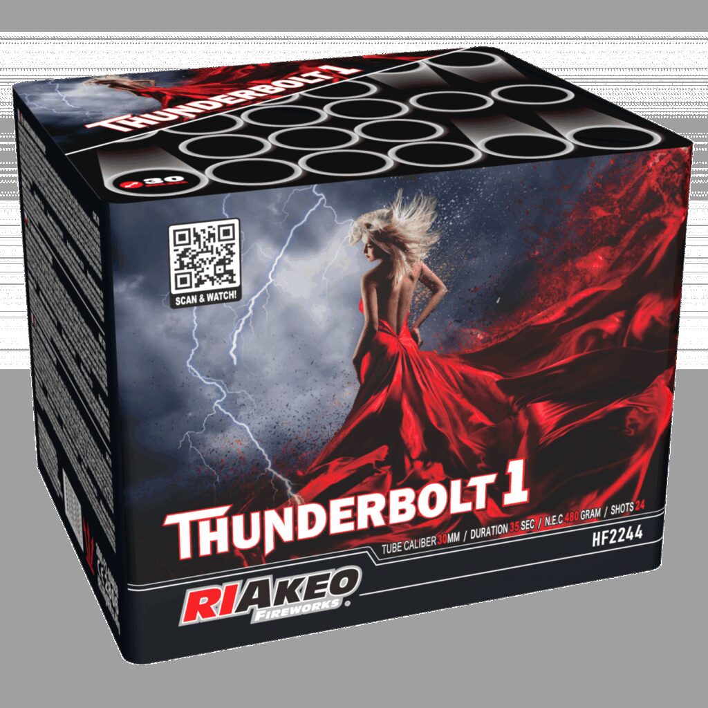 n nDe Thunderbolt 1 van Riakeo een 24 schots cake in kaliber 30mm en 500g NEM, afwisselend waaier en recht schot. n n Riakeo Fireworks Thunderbolt 1 Goedkoop vuurwerk kopen bij Vuurwerkwinkel Goes