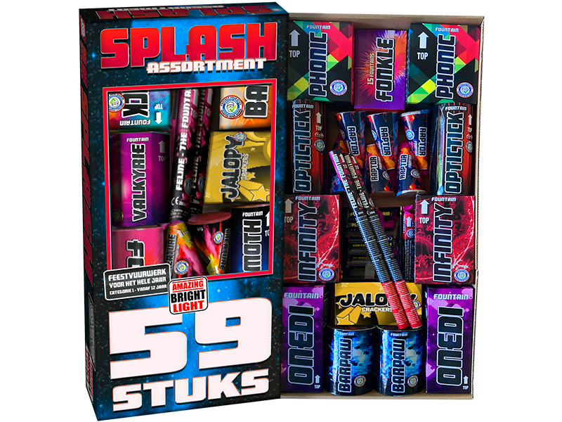 Splash nNieuw in ons assortiment. Een riante doos met veel cat. 1 vuurwerk. Oa fakkels, grondtollen en fonteinen met meer kruit dan zijn voorganger. n nKruitgewicht 223 Gram nTube diameter – nBrandtijd – Seconden nHoogte – Splash Goedkoop vuurwerk kopen bij Vuurwerkwinkel Goes
