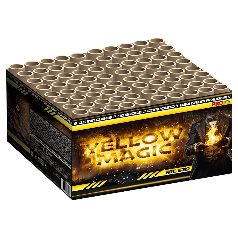 Yellow Magic, 80 shots 25mm compound. Prachtige gouden willow palmen, knetter spider/dahlia, brocade crowns met gekleurde toppen en blinkers, gevolgd door een spectaculaire willow to moving stars finale! n nProductinformatie: nType product: Siervuurwerk nEffect product: Compound nTube diameter: 25mm nFanshape: Ja nClassificatie: CAT.F2 nMinimale leeftijd: 16 jaar nLegaal afsteken op: 31 december nVeiligheidsafstand: minimaal 8 meter nGeschikt voor smalle straten: Nee nGeschikt in Gemeente vuurwerkverbod: Nee Yellow Magic 80 shots 25mm Goedkoop vuurwerk kopen bij Vuurwerkwinkel Goes